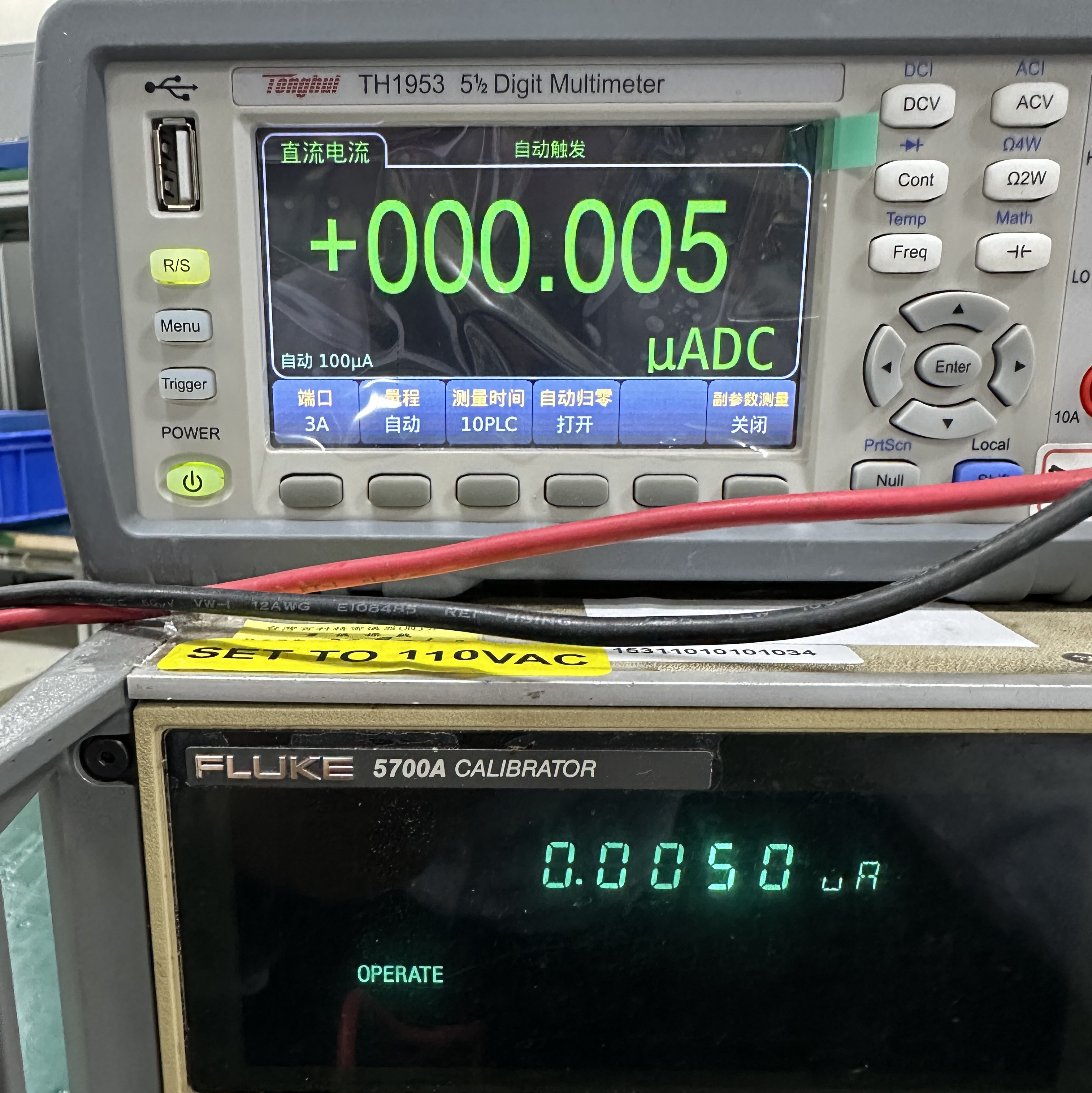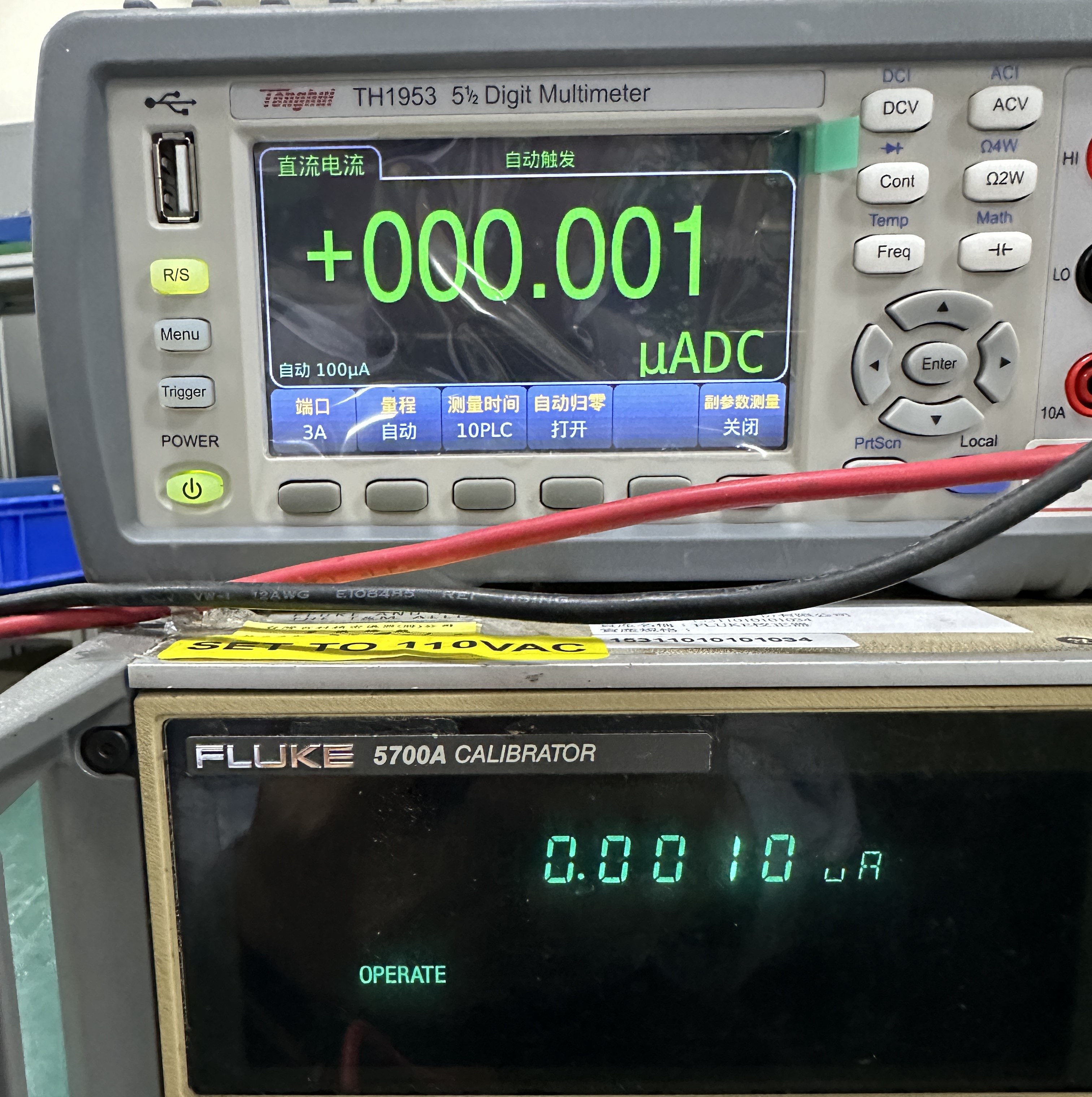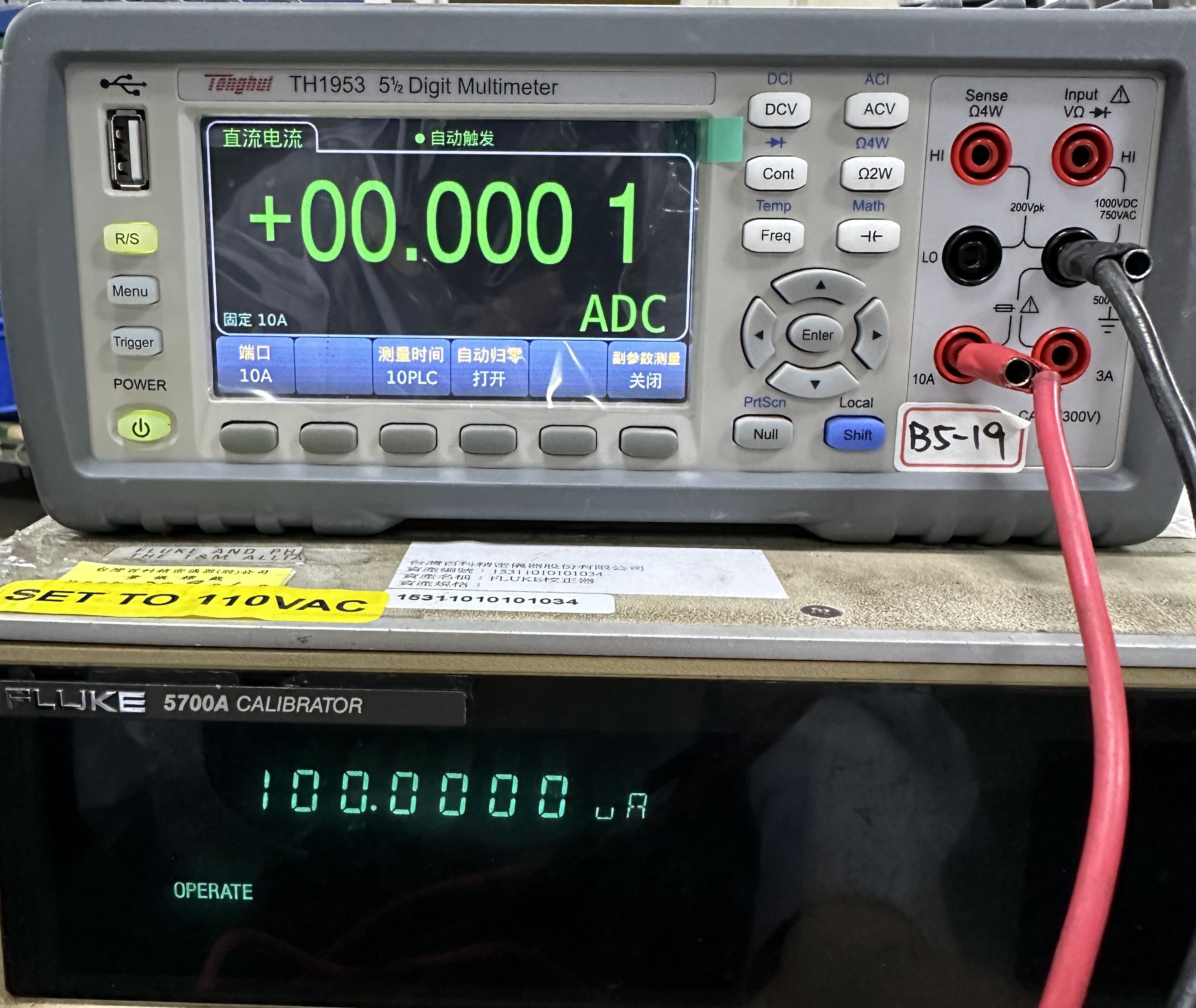 使用Fluke 5700A標準校正器輸出100uA給TH1953的10A檔位量測,實際量測畫面如下: