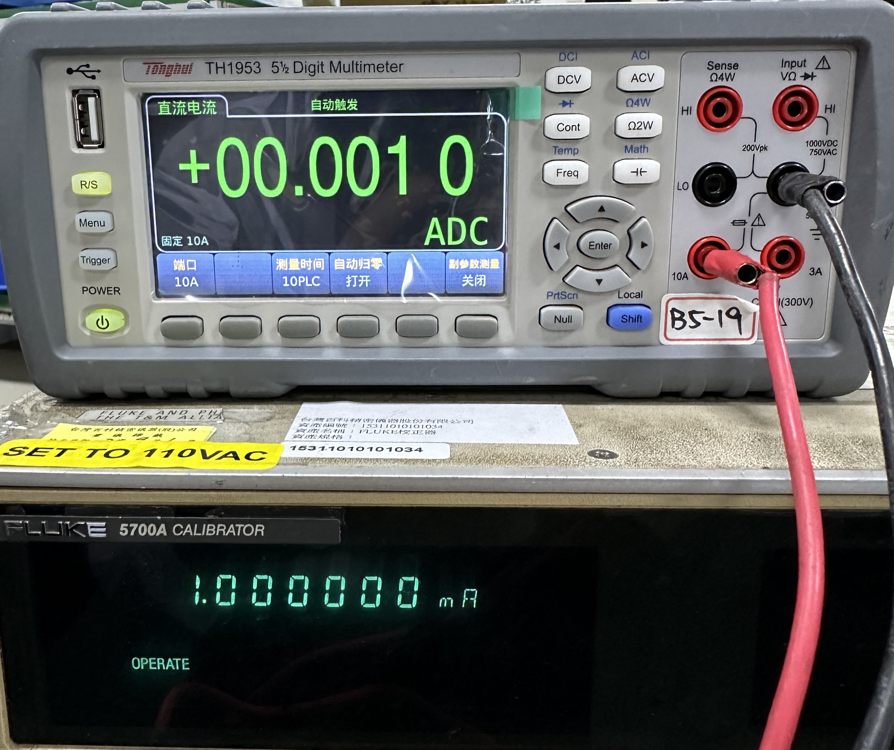 使用Fluke 5700A標準校正器輸出1mA給TH1953的10A檔位量測,實際量測畫面如下: