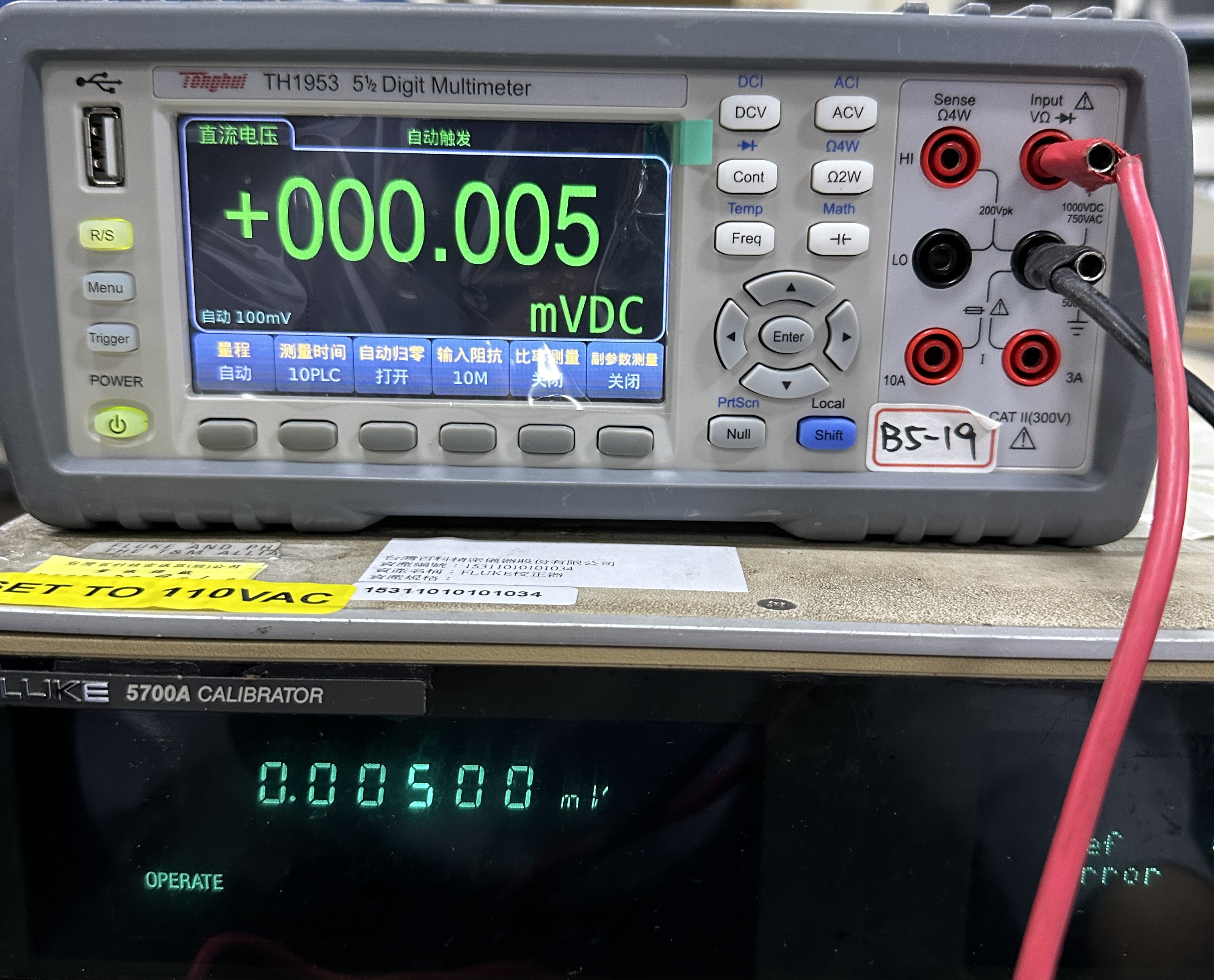 使用Fluke 5700A標準校正器輸出5uV給TH1953量測,實際量測畫面如下: